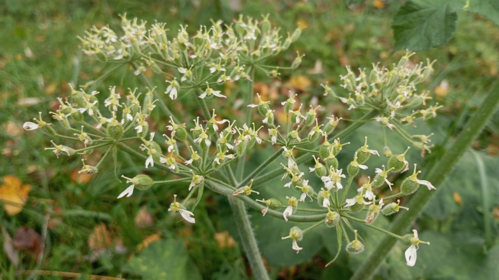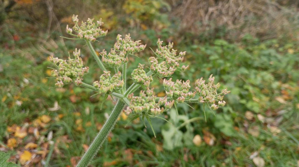 Pour revenir à la Grande berce, ses ombelles de fleurs blanches apparaissent de juin à septembre et attirent une multitude d’insectes pollinisateurs, que l’on peut observer sans même se pencher ! Sa tige et ses feuilles sont épaisses, sombres et poilues, argentées sur l’envers, sans tâches rondes rougeâtres. Dès la fin de l’été, plus de couleurs, seulement de hautes tiges sèches qui persistent tels des squelettes. Osez quand même aller sentir ses graines, en les grattant légèrement à l’ongle, vous aurez dans le nez des odeurs entre les agrumes et la bergamote !