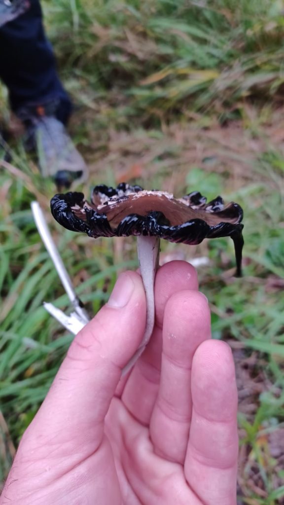 Le Coprin chevelu se mange lorsqu’il est bien blanc (une seule tache noire et il devient toxique, arf !). Un autre cousin que j’ai rencontré lors d’une balade matinale, le Coprin pied de lièvre, est, pour sa part, bien toxique !
