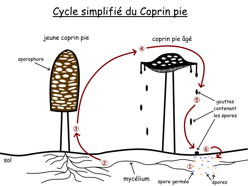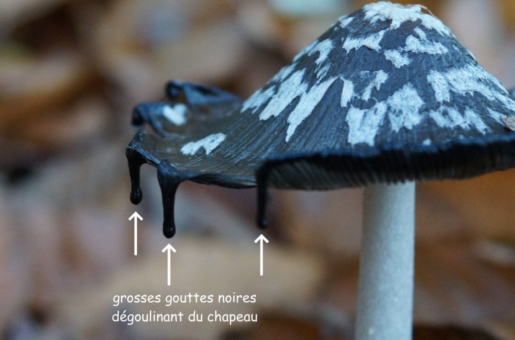 Le Coprin pie Coprinus picaceus peut adopter différentes formes. Au départ, à l’état jeune, il arbore un grand chapeau recouvert de tâches blanches qui s’effacent avec le doigt. Sa beauté est fugace : en à peine un ou deux jours seulement, son chapeau fond littéralement ! Ce phénomène s’appelle la déliquescence : le chapeau se liquéfie peu à peu, libérant de grosses gouttes noires chargées de spores (cellules reproductrices chez les champignons). Ces spores rejoignent le sol, prêtes à donner naissance pour se disperser et germer de nouveau. La formidable régénération de la nature en marche…